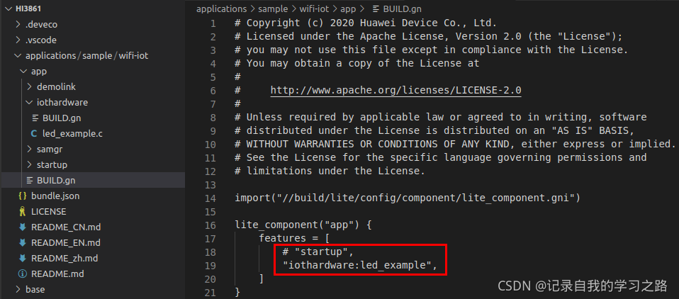- 打开"applications/sample/wifi-iot/app"目录下的BUILD.gn文件,将其中的默认的startup屏蔽或者删除,添加我们想要实际编译的("iothardware:led_example",),如图
