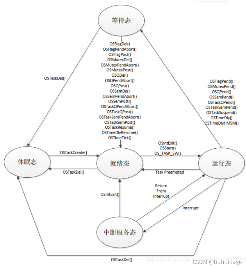 - 休眠:?任务已经在CPU的flash中了,但是还不受μCOSIII管理。