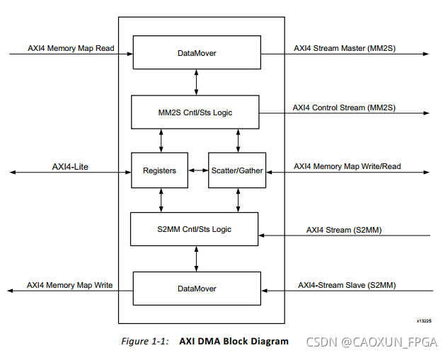 Xilinx AXI DMA软核结构框图如下,总共包含4中总线接口,本次实验用到其中的3种,AXI Memory Write/Read暂时未用到 。 该框图详见Xilinx 官方手册PG021。