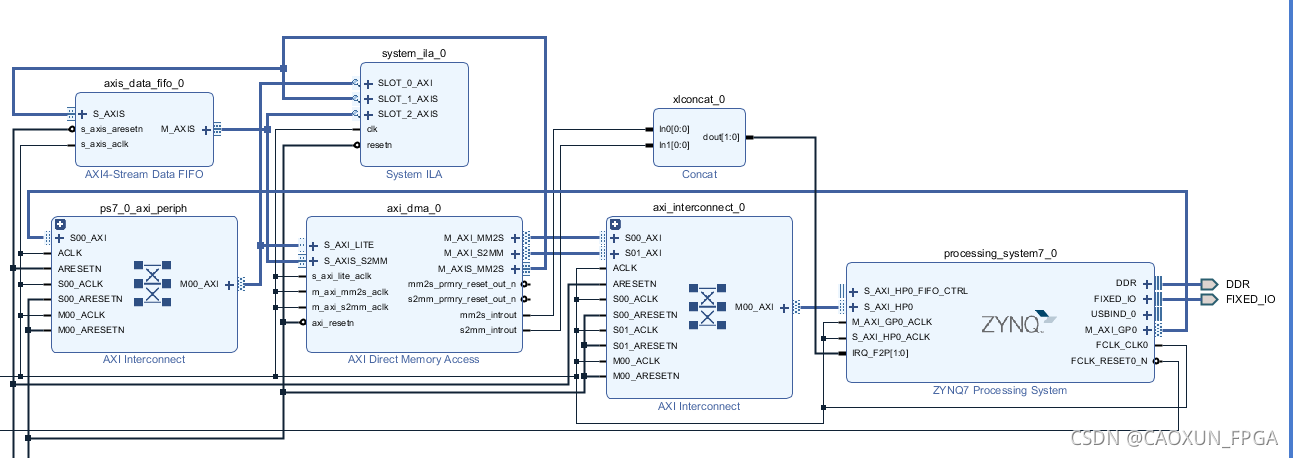 完整的DMA传输流程如下,以DMA控制器读取DDR3内存数据,然后写入到PL端的FIFO缓存来进行说明: