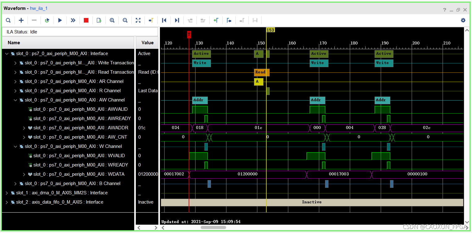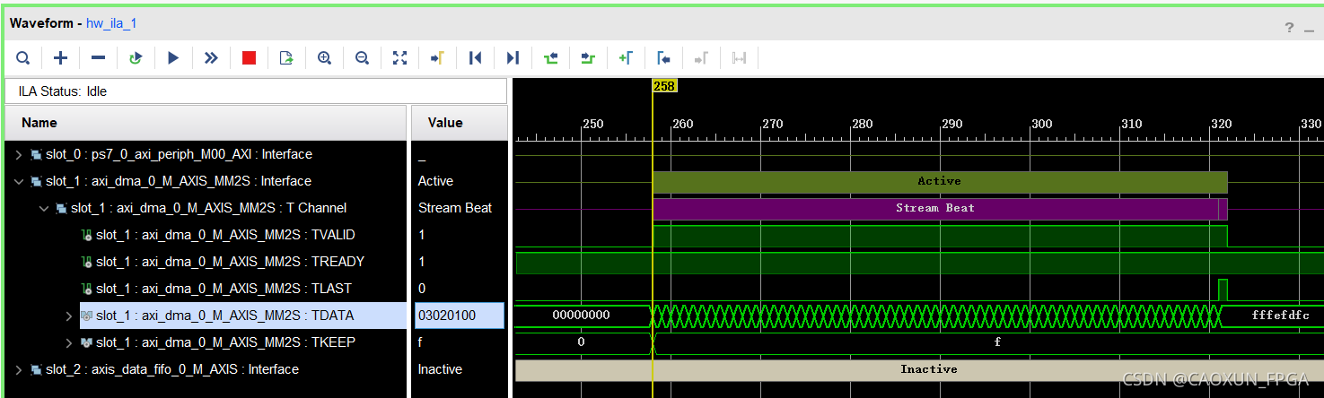 ?上图为DMA数据流传输图,采用AXI Steam接口模式进行数据发送,每个数据为32比特,高字节在前,大端模式。数据流为:0x03020100 ~ 0xFF_FE_FD_FC 。