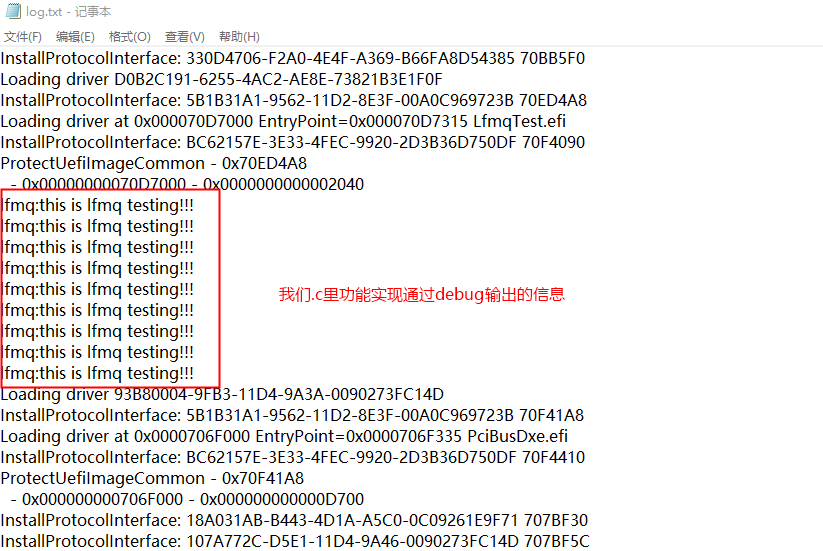 但是现在是有输出了,但是输出是输出到哪了呢?从网上了解了UEFI的调试过程后可以知道,UEFI开机的几个阶段中执行过程中会输出debug log来为工程师提供调试。通过查阅后我发现我们的debug的输出的地方就在此日志文件中。