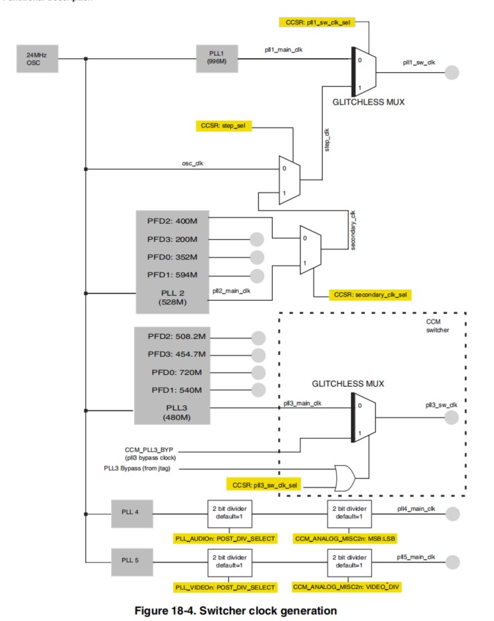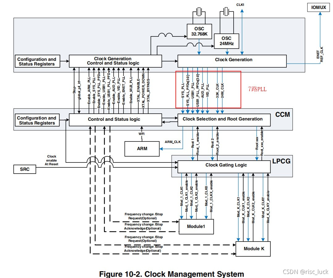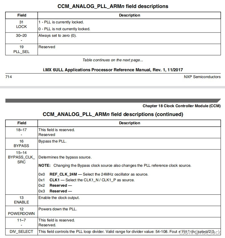 首先我们来看一下时钟管理系统:  IMX6ULL有7个锁相环电路,它们的输入时钟信号称为源时钟信号,可通过寄存器选择,通常为XTALOSC24M产生的24MHZ时钟信号。它们的输出经过进一步选择和分频,形成不同的根时钟信号,分发到各个模块使用。imx6ull 7路PLL具体产生方式如下: ![[外链图片转存失败,源站可能有防盗链机制,建议将图片保存下来直接上传(img-cczo4a4N-1631186411137)(E:\u-boot\pic\IMX6ULL_CCM.jpg)]](https://img-blog.csdnimg.cn/bff886b1005349b2baab50d2f03030bf.jpg?x-oss-process=image/watermark,type_ZHJvaWRzYW5zZmFsbGJhY2s,shadow_50,text_Q1NETiBAcmlzY19sdWNr,size_20,color_FFFFFF,t_70,g_se,x_16) 时钟生成部分包含七个PLL。 其中两个PLL每个都配备了四个相位分数分配器(PFDs),以产生额外的频率。每个PFD通过插值其连接的PLL的VCO独立工作。它有效地利用PLLVCO频率,并在N从12到35的输出处产生18/NxFvco。PFD是一种完全数字化的设计,没有模拟元件或反馈回路。频率开关时间比锁相环快得多,因为保持基本锁相环锁定和改变整数N只会改变VCO插值输出的逻辑组合。请注意,PFD不仅允许比PLL更快的频率变化,而且允许在不经历输出时钟禁用/禁用过程的情况下安全地“动态”更改配置。 以下列出了七个PLL: 1.PLL1(ARM_PLL) 用来驱动ARM核心工作 ,最大可编程至1.3GHZ,比芯片最大可支持的频率1.0GHZ要高。 2.PLL2(System_PLL or 528_PLL),在24M外部晶振条件下,以固定22倍频输出528MHZ频率,除了主输出,该PLL还驱动四路PFD(PLL2_PFD0 … PLL2_PFD3).主锁相环输出及其PFD输出作为许多时钟根的输入.这些不需要精确/恒定的频率,可以作为动态频率缩放过程的一部分进行更改.通常,该PLL或其PFD是内部系统总线、内部处理逻辑、DDR接口、NAND/NOR接口模块等的时钟源 3.PLL3(USB1_PLL), PLL3被应用于与USB PHY第一个示例相结合,该锁相环驱动四个PFD (PLL3_PFD0… PLL3_PFD3),并以20的固定倍频输出480MHZ。 4.PLL4(Audio PLL) 这是一个分数乘法器锁相环,用于产生低抖动和高精度的音频时钟与标准化的音频频率。锁相环振荡器频率范围从650MHz到1300MHz,频率分辨率优于1Hz。该时钟主要用作串行音频接口的时钟和外部音频编解码器的参考时钟。它的输出上装有一个分频器,可以从PLLVCO频率产生除以1、2或4 5.PLL5(Video PLL)这是一个分数乘法器锁相环,用于产生低抖动和高精度的视频时钟与标准化的视频频率,锁相环振荡器频率范围从650MHz到1300MHz,频率分辨率优于1Hz。 该时钟主要用作显示和视频接口的时钟。它在其输出上配备了分配器,可以从PLLVCO频率产生时钟除以1、2、4、8或16 6.PLL6(ENET_PLL)这个PLL实现了一个固定的20(5/6)乘数。 具有24MHz的输入,其VCO频率为500MHz。 此PLL用于生成: ①外部以太网接口的50或25MHz ②125MHz用于简化的千兆以太网接口 ③通用100MHz 7.PLL7(USB2_PLL) 这个PLL专门为USB2PHY(USBPHY2,也称为OTGPHY)提供时钟)。 它以20的固定乘数运行,导致VCO频率为480MHz。