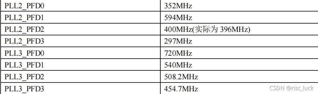 nxp 推荐的PFD频率如下: PLL2的4路PFD频率使用寄存器 CCM_ANALOG_PFD_528n配置 ![[外链图片转存失败,源站可能有防盗链机制,建议将图片保存下来直接上传(img-NazZCU0Z-1631186411145)(E:\u-boot\pic\CCM_ANALOG_PFD_528n.jpg)]](https://img-blog.csdnimg.cn/34422cf910954482aab68ff48c311968.jpg?x-oss-process=image/watermark,type_ZHJvaWRzYW5zZmFsbGJhY2s,shadow_50,text_Q1NETiBAcmlzY19sdWNr,size_19,color_FFFFFF,t_70,g_se,x_16) 寄存器 CCM_ANALOG_PFD_528n 其实分为四组,分别对应PFD0~PFD3,每组 8 个 bit,我们就以 PFD0 为例,看一下如何设置 PLL2_PFD0 的频率。PFD0对应的寄存器位如下:PFD0_FRAC: PLL2_PFD0 的分频数,PLL2_PFD0 的计算公式为 528x18/PFD0_FRAC,此为可设置的范围为 12~35 。 如 果 PLL2_PFD0 的频率要设置为 352MHz 的 话 PFD0_FRAC=528*18/352=27。 PFD0_STABLE: 此位为只读位,可以通过读取此位判断 PLL2_PFD0 是否稳定。 PFD0_CLKGATE: PLL2_PFD0 输出使能位,为 1 的时候关闭 PLL2_PFD0 的输出,为 0 的时候使能输出。 PLL3的4路pfd频率设置是类似的,只不过寄存器改为CCM_ANALOG_PFD_480n, 公式为 480x18/PFDx_FRAC