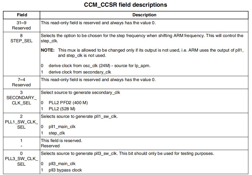 根据上述,我们知道主频主要涉及到PLL1设置以及CCM_CACRR 分频系数设定。正常工作时,CPU使用锁相环电路ARM_PLL的输出信号作为时钟源。在改变CPU频率之前,我们首先切换到其它时钟信号(示例中选择晶体振荡电路XTALOSC24M的输出),修改ARM_PLL设置并稳定在新的频率之后,再切换回ARM_PLL的输出时钟信号。具体步骤如下: