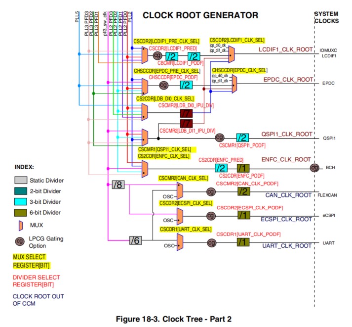 7路PLL并不能直接提供给其他模块直接使用,他们需要经过选择、分频后形成根时钟信号,然后分发给各个模块使用(结合时钟管理的图理解更深刻)。根时钟信号电路分为两部分,时钟切换电路和根时钟生成电路。The Clock Switcher (CCM_CLK_SWITCHER) sub-module receives the PLL output clocks and the PLL bypass clocks.时钟切换电路主要对PLL1和PLL3的输出进行选择,被选中的信号形成pll1_sw_clk和pll3_sw_clk信号。另外,它还对PLL4和PLL5进行额外的分频操作,形成pll4_main_clk和pll5_main_clk信号。其框图如下:  后续电路不直接使用上述PLL的输出,而是使用switcher形成的这些输出信号。例如,如果我们想改变CPU的工作频率,可以先修改CCSR[pll1_sw_clk_sel]将pll1_sw_clk切换到step_clk,然后修改PLL1的参数,等待其输出时钟信号稳定到新的频率上,再切换回PLL1的输出信号pll1_main_clk。因为使用了无抖动的多路选择器(glitchless multiplexer),在切换过程中CPU仍正常运行,我们将在第一个编程示例中演示上述过程。 The Clock Root Generator (CCM_CLK_ROOT_GEN) sub-module generates the root clocks to be delivered to LPCG. 如下图所示:  具体的时钟配置可以参考下面的时钟树: ![[外链图片转存失败,源站可能有防盗链机制,建议将图片保存下来直接上传(img-aBu4b3zQ-1631186411141)(E:\u-boot\pic\clock tree1.jpg)]](https://img-blog.csdnimg.cn/b1873e85428a444a88d5d718564c466e.jpg?x-oss-process=image/watermark,type_ZHJvaWRzYW5zZmFsbGJhY2s,shadow_50,text_Q1NETiBAcmlzY19sdWNr,size_20,color_FFFFFF,t_70,g_se,x_16)