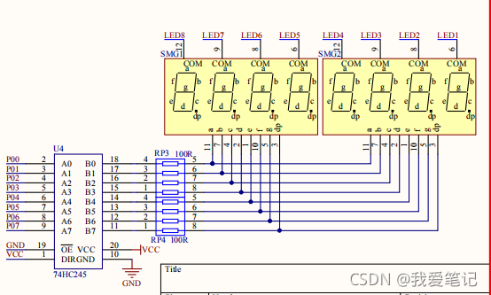 ??????? 从以上图我们可以看到我这里的上面就是每个数码管的共阴极,我们一般称这个为段选线,我们只要选择一条给它一个低电平,那么我们下面的其他的线全部给我们想要的位一些高电平,那么我们的数码管就能点亮成为我们自己想要的数字。可以注意到我们给a电平的时候对应的a位就会被点亮。而关于其中的74HC245芯片,关于每一个芯片我们第一件事情都应该说是去查它的芯片手册,首先我们为什么需要74HC245这个芯片呢?其实这里和我们上一节讲的东西十分相似,就是说51单片机的驱动能力不行,需要我们给它增加驱动能力,这里就是我们添加74HC245的原因,而关于它我们其实是不需要配置的,因为在硬件上面我们就做好了相应的配置,给DE引脚一个低电平来使能,就是说让芯片工作,而且呢vcc是给了一个高电平的话就可以从A到B输出,这样的话关于数码管的硬件就讲的差不多了,但是我的上面的段选线并不是直接接到gpio上面的,而是选择接到了38译码器上,如下图所示