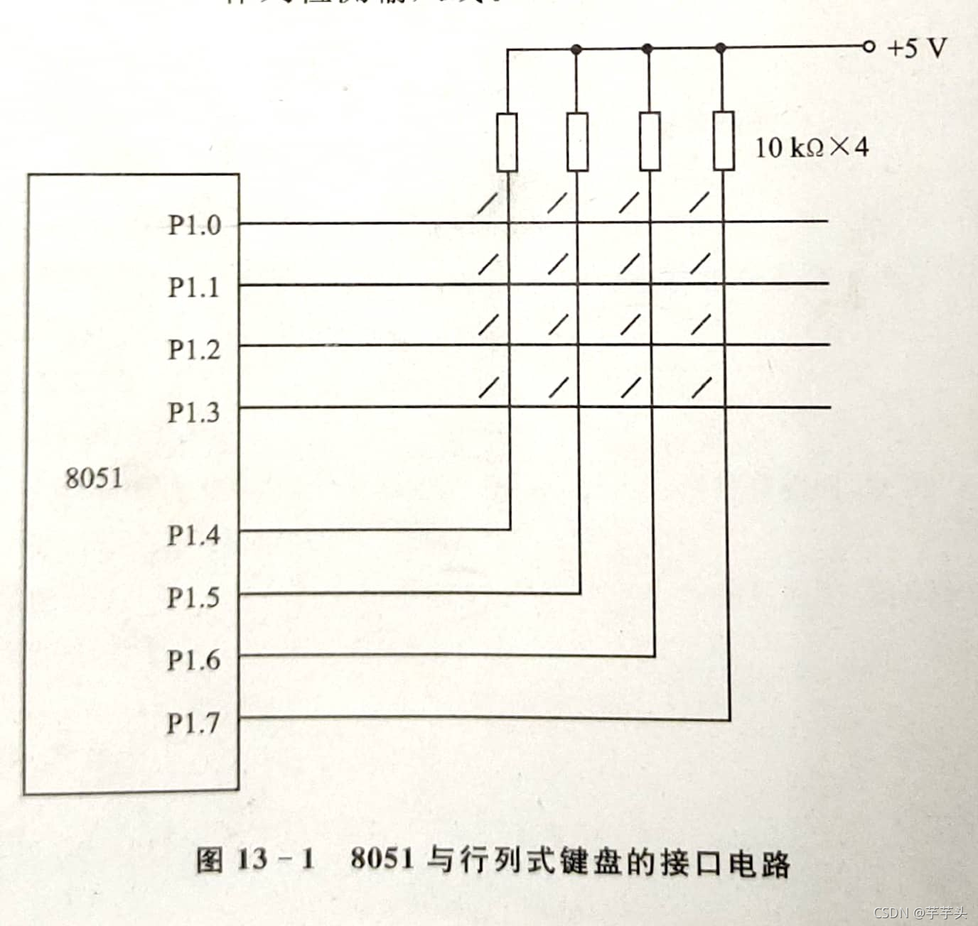 ???????要理解如何矩阵程序,就要明白其内部电路。图13-1是8051与行列式键盘的接口电路图。要明白斜杠表示什么,为什么要有电源,为什么电源下面接了4个电阻。