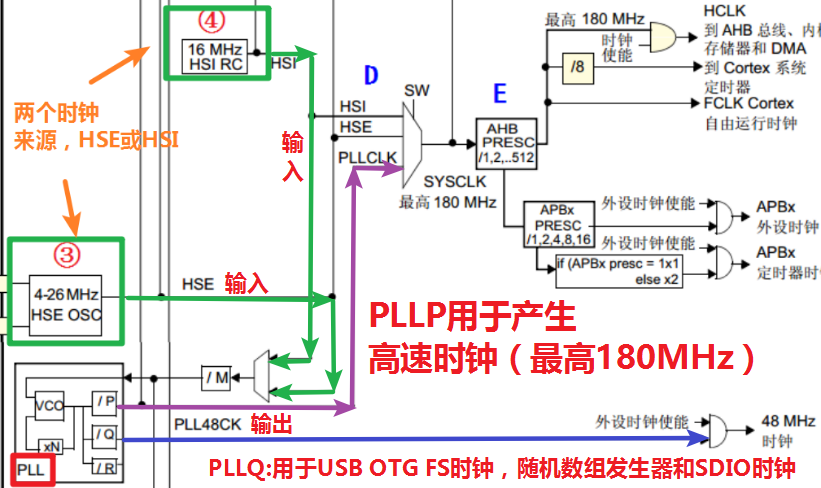 ?????????PLL 为锁相环倍频输出。 STM32F4 有三个 PLL: ????????1)主 PLL(PLL)由 HSE 或者 HSI 提供时钟信号,并具有两个不同的输出时钟。第一个输出 PLLP 用于生成高速的系统时钟(最高 180MHz)第二个输出 PLLQ 为 48M 时钟, 用于 USB OTG FS 时钟,随机数发生器的时钟和 SDIO时钟。