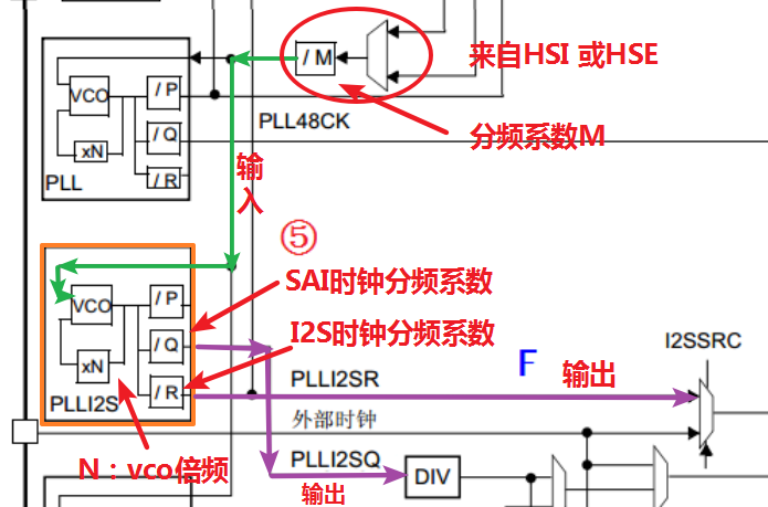 ????????2)第一个专用 PLL(PLLI2S)用于生成精确时钟, 在 I2S 和 SAI1 上实现高品质音频性能。 其中, N 是用于 PLLI2S vco 的倍频系数,其取值范围是: 192~432; R 是 I2S 时钟的分频系数,其取值范围是: 2~7; Q 是 SAI 时钟分频系数,其取值范围是: 2~15; P 没用到。