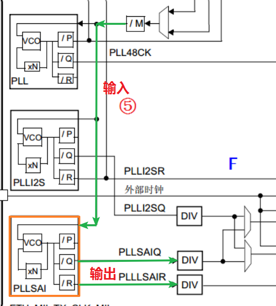 ????????3)第二个专用 PLL(PLLSAI)同样用于生成精确时钟,用于 SAI1 输入时钟,同时还为 LCD_TFT接口提供精确时钟。 其中, N 是用于 PLLSAI vco 的倍频系数,其取值范围是: 192~432;Q 是 SAI 时钟分频系数,其取值范围是: 2~15; R 是 LTDC 时钟的分频系数,其取值范围是: 2~7; P 没用到。