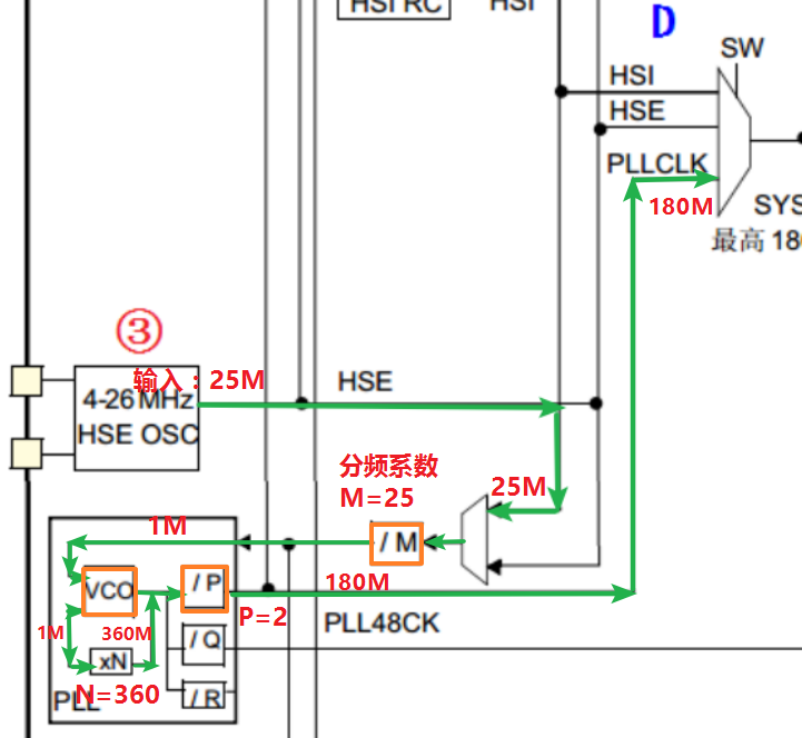 ????????例子:主 PLL 时钟第一个高速时钟输出 PLLP 的计算方法:配置180MHz为例: