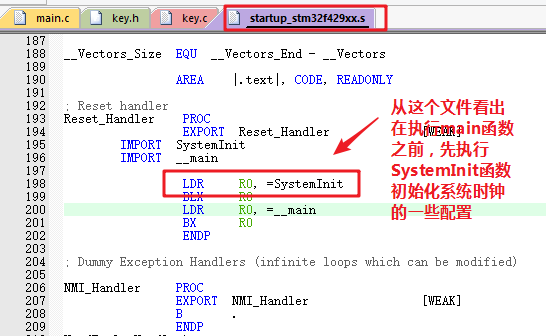 ????????其中,IMPORT ?__main和IMPORT ?SystemInit语句:IMPORT 声明了需要引用C语言中的main函数、systeminit函数; ? ? ? ? ? ? ? ? LDR R0, = systeminint语句:把systeminit 函数地址放到r0 寄存器; ? ? ? ? ? ? ? ? BLX ? R0语句:跳到到R0 寄存器中的地址执行; ????????所以,在跳到main函数执行前,已经在SystemInit 函数中把系统时钟给设置好了;