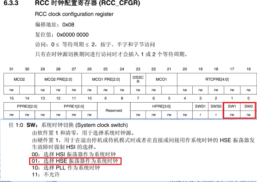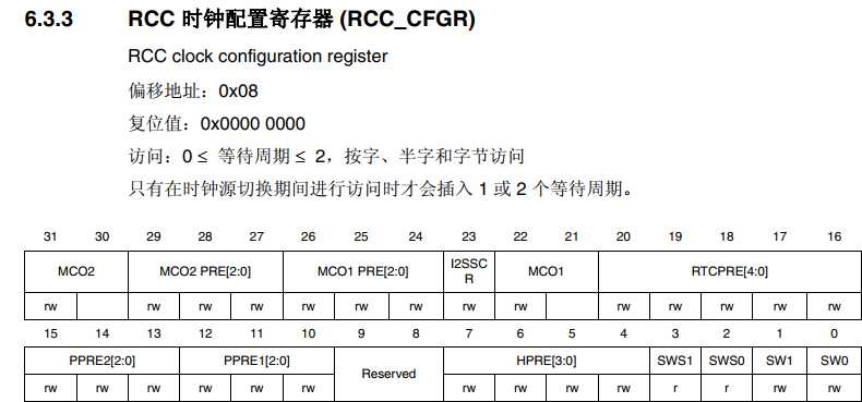 RCC->CFGR = 0x00000000;//复位 CFGR 寄存器