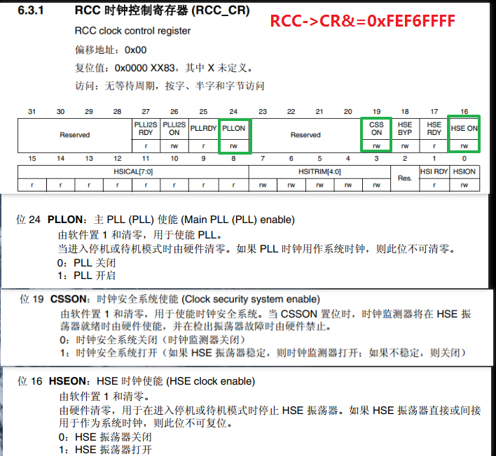 RCC->CR&=0xFEF6FFFF; //HSEON,CSSON,PLLON清零