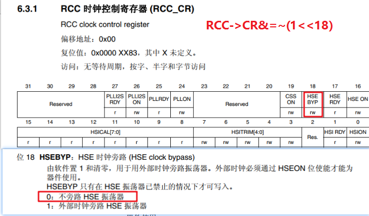 RCC->CR&=~(1<<18); //HSEBYP清零,外部晶振不旁路