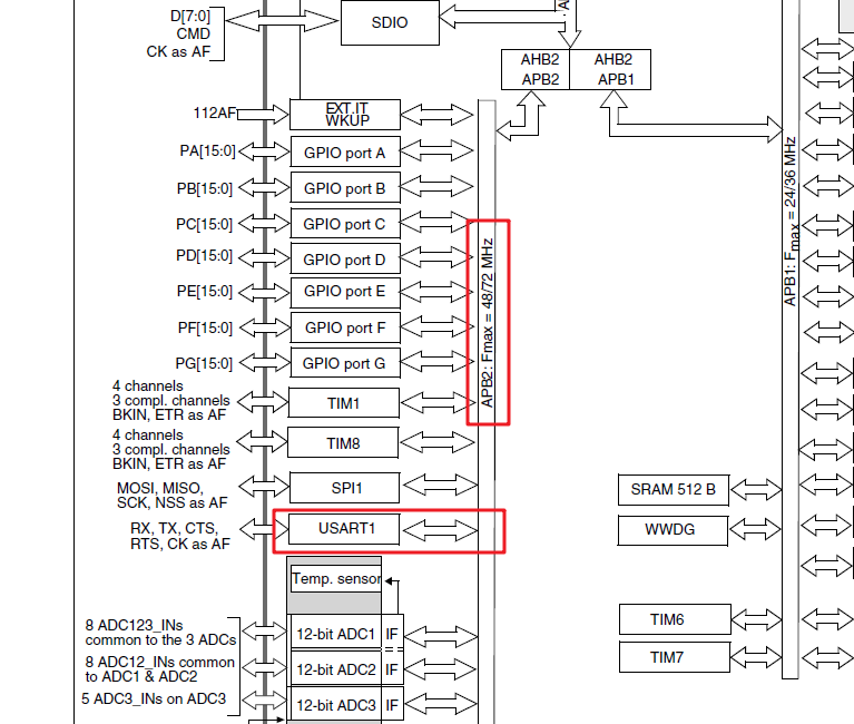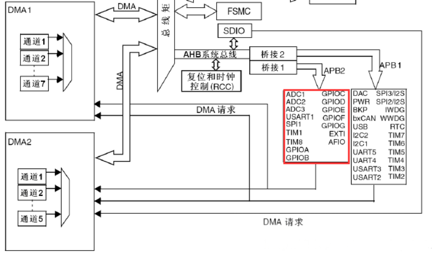 ????????APB1上面连接的是低速外设,包括电源接口、备份接口、CAN、USB、I2C1、I2C2、USART2、USART3、UART4、UART5、SPI2、SP3等; ????????APB2上面连接的是高速外设,包括UART1、SPI1、Timer1、ADC1、ADC2、ADC3、所有的普通I/O口(PA-PE)、第二功能I/O(AFIO)口等。