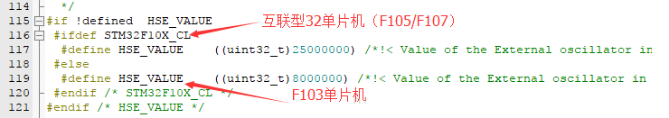 ????????STM32 有5个时钟源:HSI、HSE、LSI、LSE、PLL。 ????????????????①HSI是高速内部时钟,RC振荡器,频率为16MHz,精度不高。可以直接作为系统时钟或者用作PLL时钟输入。 ? ????????????????②HSE是高速外部时钟,可接石英/陶瓷谐振器,或者接外部时钟源,频率范围为4MHz~26MHz。(此处以25M为例) ????????????????③LSI是低速内部时钟,RC振荡器,频率为32kHz,提供低功耗时钟。主要供独立看门狗和自动唤醒单元使用。 ? ????????????????④LSE是低速外部时钟,接频率为32.768kHz的石英晶体。RTC ? ????????????????⑤PLL为锁相环倍频输出。