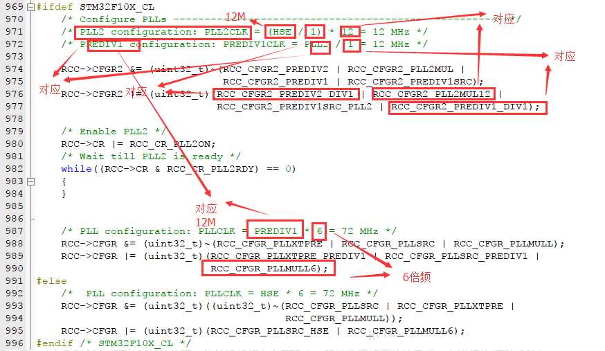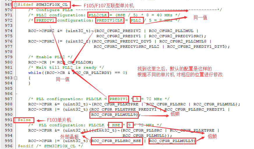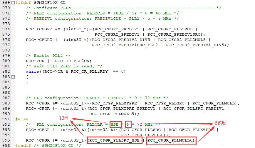RCC_PLLConfig(RCC_PLLSource_HSE_Div1,RCC_PLLMul_9); //PLLCLK = 8MHZ * 9 =72MHZ