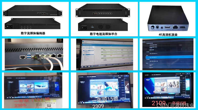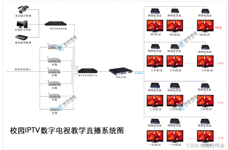 ? ? ? ?淮安生态文旅区实验小学,坐落在素有“运河之都”美誉的淮安市。学校占地72亩,建筑面积4.9万平方米,现有6个年级60个班,学校扩建后将有120个班。为给学生提供更加先进、科学的教学环境,给师生提供更加清晰的电视教学画面、声音体验,学校决定对原有模拟电视教学系统进行改造,建设校园IPTV数字电视教学直播系统。该系统同传统的闭路电视等电化教学手段不同,具有“节目源选择广泛、数字化信号传输、节目无失真还原、功能强稳定可靠”等特点,完全满足中小学校的个性化高清教学需求。 ? ? ? ?校园IPTV数字电视教学直播系统以校园局域网为传输媒介,通过TCP/IP协议传输MPEGII格式视频、MP3音频电视的教学直播节目,视频可达到4K高清画质,完全实现了电视教学直播节目无网纹、无噪点、无噪声叠加。该系统已于9月上旬建成并正式投入使用,可以实现学校60个班(以后可扩展至120个班接)高清收看多功能厅会议直播、多媒体教室示范课、外语听力教学、当地有线电视等教育教学节目。系统预留教学节目IP互动点播接口。 二、校园IPTV数字电视教学直播系统组成