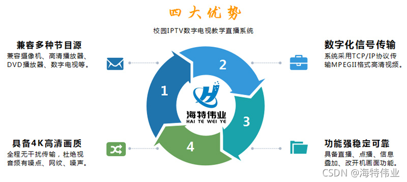 ?1、节目源选择广泛 可兼容DVD、摄像机、高清播放器、卫星电视、当地数字电视、电视台自动播放系统等节目源,节目源选择范围广泛,方便充分利用现有各种格式和方式的教育教学资源。 2、数字化信号传输 信号在传输过程中采用MPEGII数字编码方式射频传输,传输中信号高保真输送,无失真、噪声小,完全没有网纹、噪点、横纹等干扰情况。 3、节目无失真还原 由于采用数字编码方式,避免了模拟调制所产生的波形变形、噪声加入等,使音视频无失真还原。 4、功能强稳定可靠 功能强大,不仅具备传统多媒体直播功能,还加入电视台自动播出系统,使得电视节目播放实现无人值守播出,大大方便了学校对节目的播出管理和控制。 ?? 五、校园IPTV数字电视教学直播系统应用