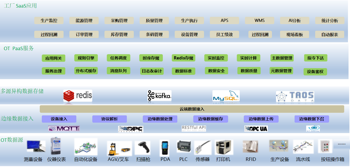 ?? ? 边缘数据接入:边缘数据接入,能采用OPC尽量采用OPC进行连接,OPC驱动不支持的再采用其他方案。直接与OT设备对接只能依照OT设备协议进行,偏IT的设备也可以采用RestfulApi,MQTT等协议。 必须要考虑OT设备时间同步问题,时间不同步数据虽然可以接受和存储,但对于后续的数据分析和流式计算会带来麻烦。 ? ? 数据存储:提供Kafka缓存、Redis、时序库多种存储方式,提供Mysql主数据和元数据存储。 ? ? PaaS服务:提供OT数仓的存储、读取、计算、数据管理等通用功能,为上层SaaS应用提供多样化的OT数据服务。 ? ? SaaS应用:基于OT数据的应用,比如设备监控、生产监控、生产过程回溯等。这个不在本次范围内详述。
