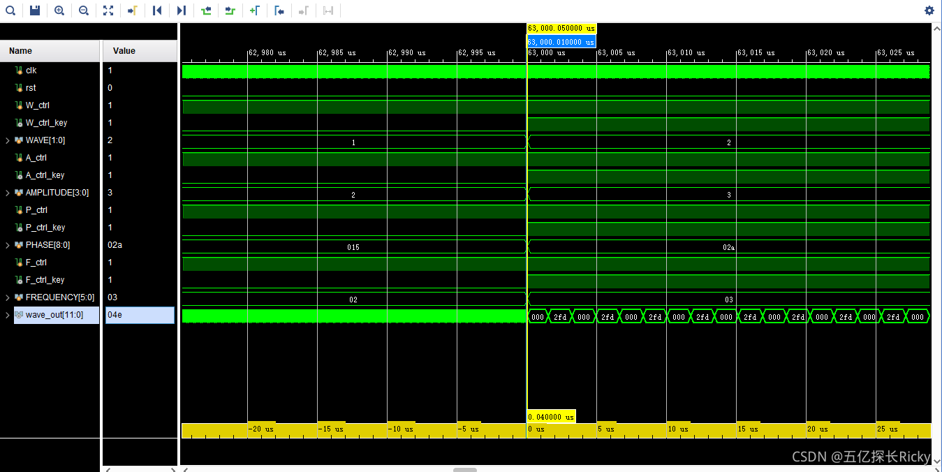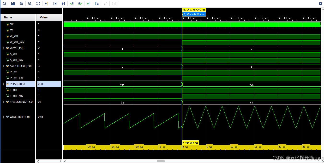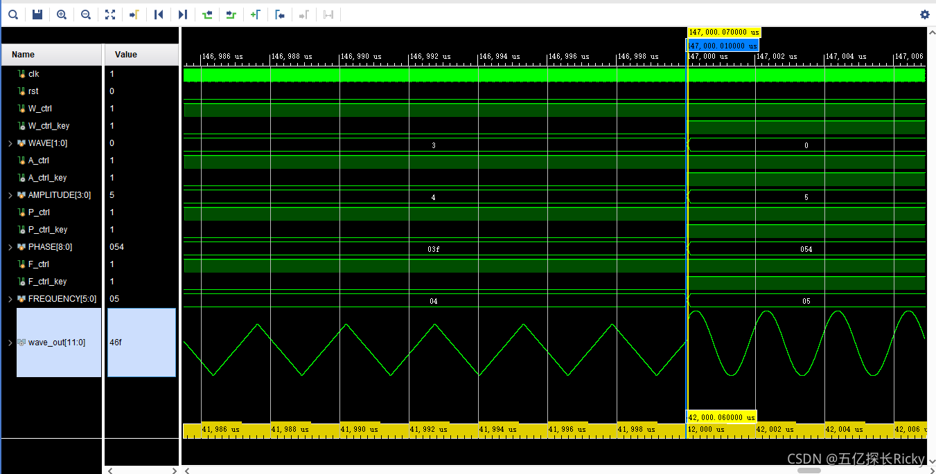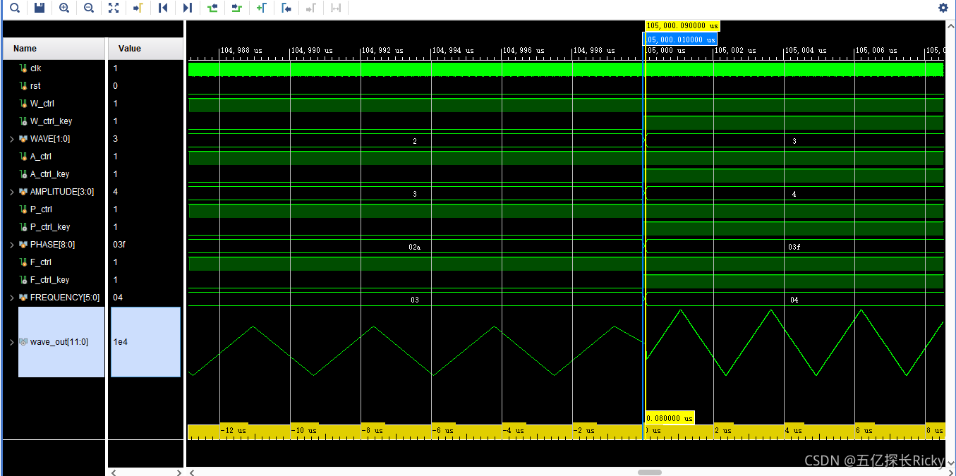 ????????由上图可以看到,当4个控制键第二次按下时,波形由锯齿波变为方波(图中模拟波形显示的是三角波,但是根据图13所示,转为数字显示后确实是方波的波形数据,所以在这里我怀疑应该是Vivado仿真器分辨率的问题),同时相较一开始的正弦波,相移30°,倍频3倍,幅度放大3倍。