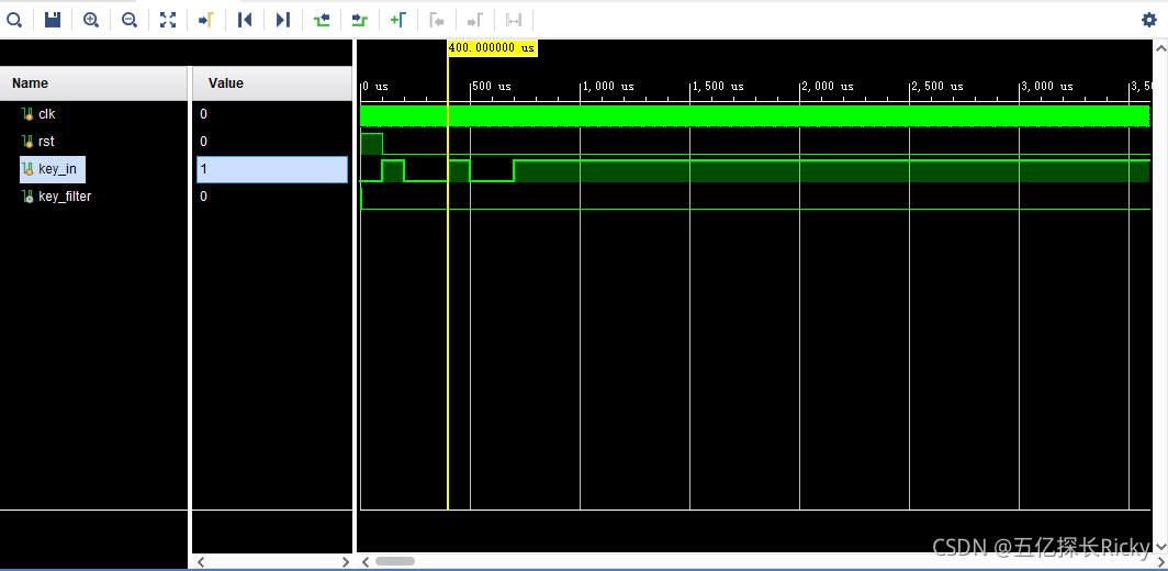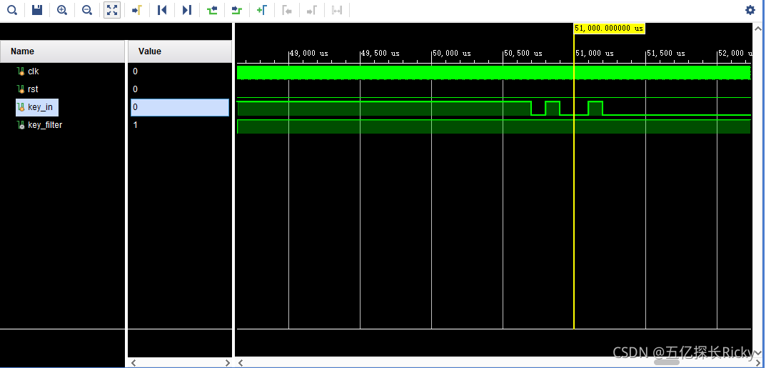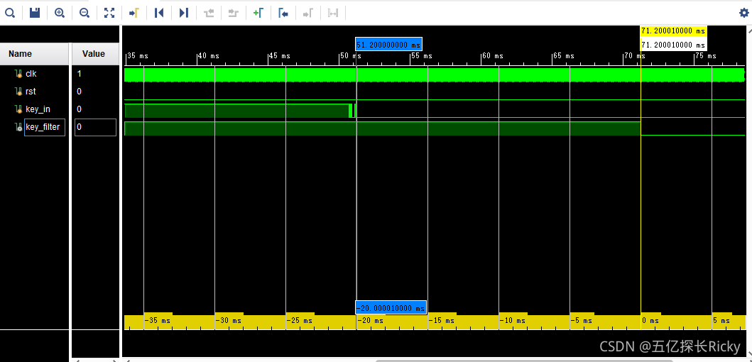 ????????状态S3:该状态在按键松开时控制一个计时器进行计时,若计时器还未计到20ms,按键电平就拉高,说明产生了一次松开抖动,状态不跳转且计时器清零;若计时器计到20ms,按键电平还未拉高,说明松开已经稳定,计时器清零且状态跳转到S0。