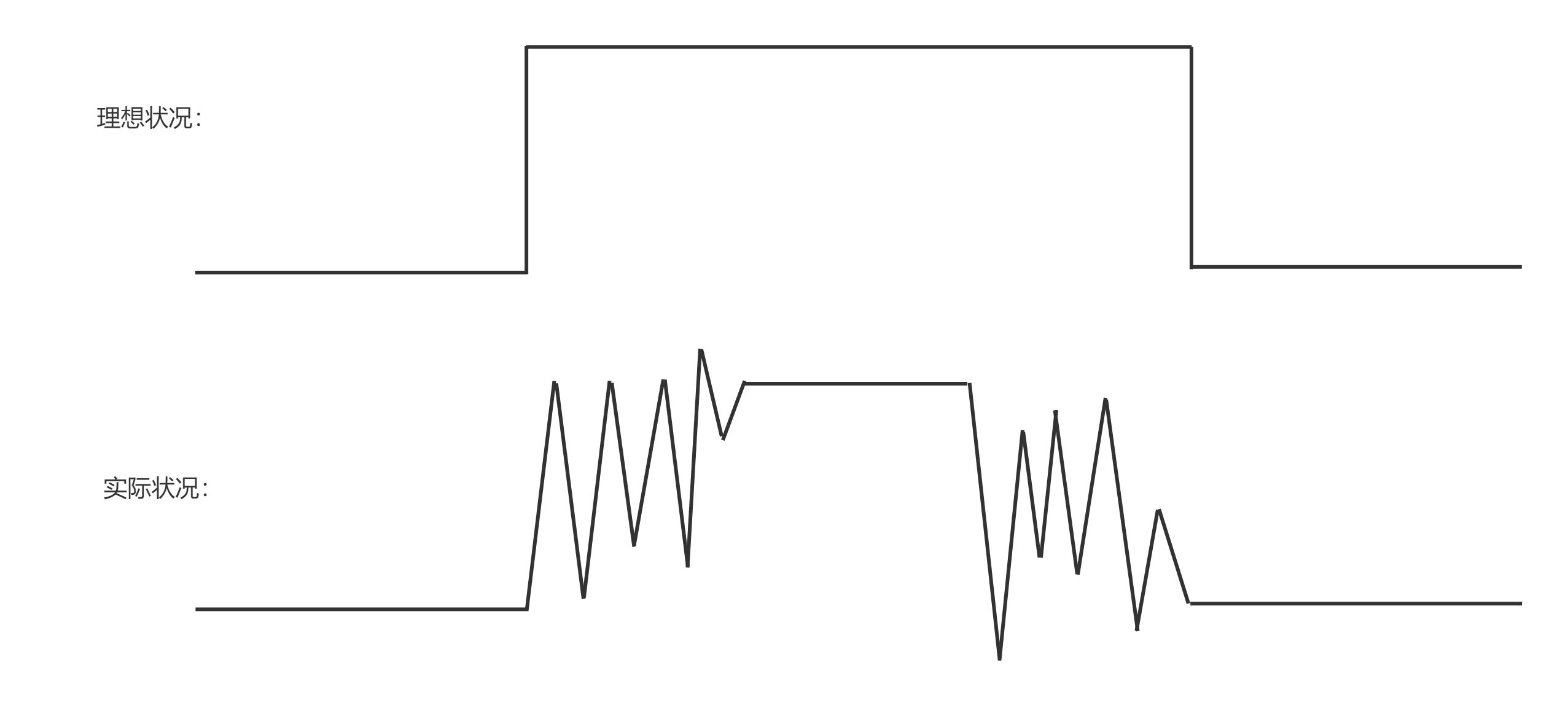 ? ? ? ? 由于机械按键里有一个复位弹簧,相当于一个欠阻尼二阶振荡系统,具有一定的惯性,所以当按键按下和松开时,会先振荡一段时间,然后才稳定到一个确定的电平。图2为理想和实际的按键电平时序图: