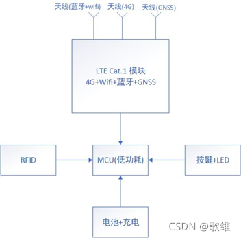 终端主要负责采集卫星定位信息(户外)和蓝牙广播报文(室内),同时将这些信息通过运营商网络上传到后台服务器,服务器分析这些数据,通过算法计算出终端的位置,然后在地图应用中展示出来,支持用户二次开发。终端的硬件方案如下图所示: