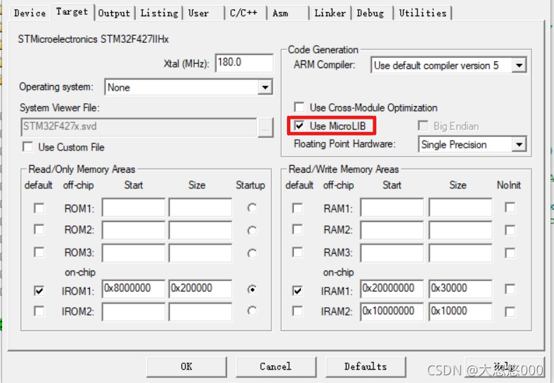 MicroLIB是缺省C库的备选库,用于必须在极少量内存环境下运行的深层嵌入式程序开发。printf函数是基于C库实现的,所以这里需要勾选。