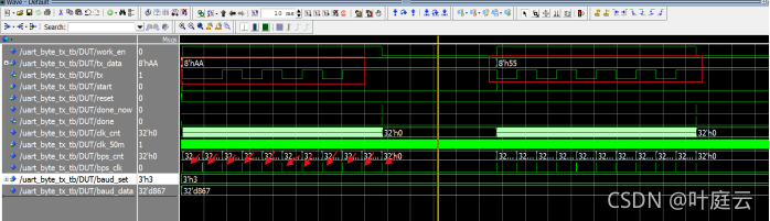 设置好仿真脚本后运行 ModelSim 进行功能仿真,得到如下图所示的波形文件。分析可知:每当一个字节发送结束后,数据输出data_byte_r均会更新输出一次,符合设计预期。