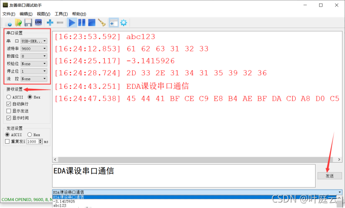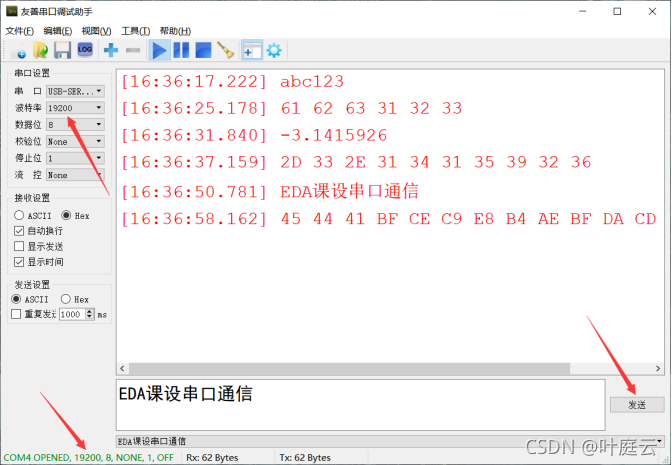 如下图所示。串口打开后,在发送文本框中输入数据 abc123 并点击发送,可以看到串口助手中接收到了数据。在接收设置为 ASCII 时,显示abc123;在接收设置为 Hex(十六进制)时,显示61 62 63 31 32 33。分析可知接收到的数据与发送的数据一致,设计验证正确。
