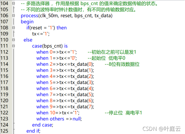 在模块结构图中还有一个多路选择器,作用是根据 bps_cnt 的值来确定数据传输的状态。不同的波特率时钟计数值时,有不同的传输数据对应。