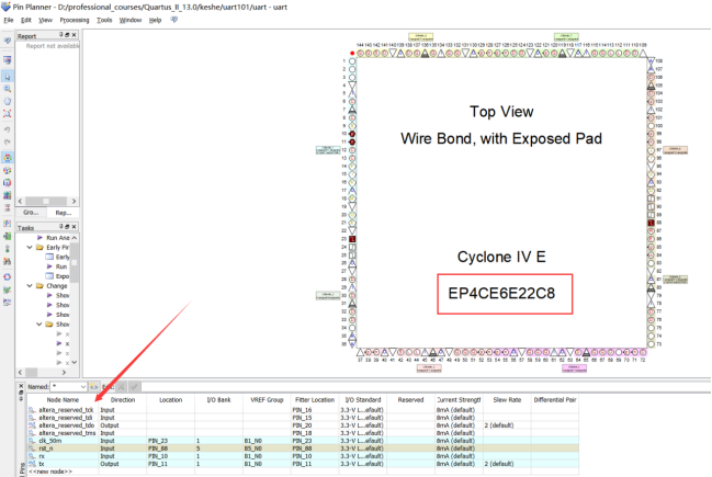 我们选用 Cyclone IV E 系列的 EP4CE6E22C8 芯片,最终的管脚安排 Pin Planner 如下图所示。