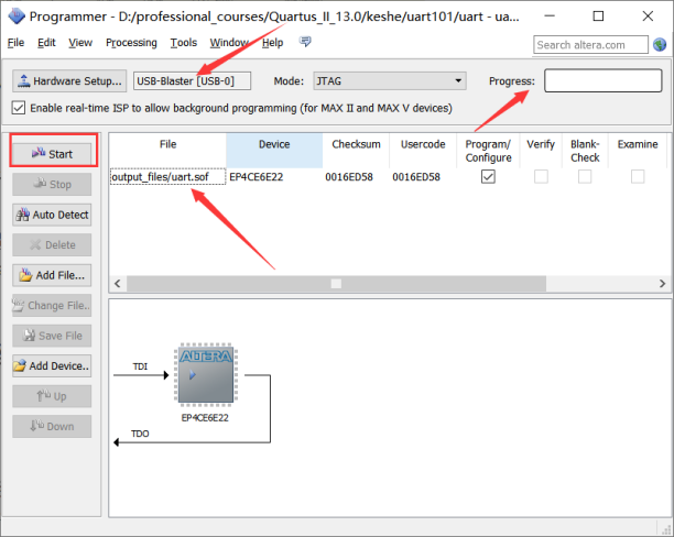 通过 USB 线缆连接 FPGA 开发板和 PC 机, Hardware Setup设置为USB-Blaster [USB-0],下载 sof 文件到 FPGA 开发板中。如下图所示。