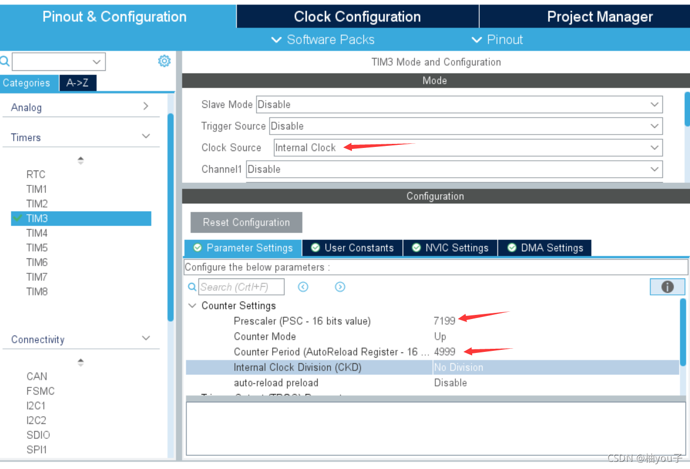 (2)设置Prescaler和Counter Period参数(根据定时时间灵活配对)。