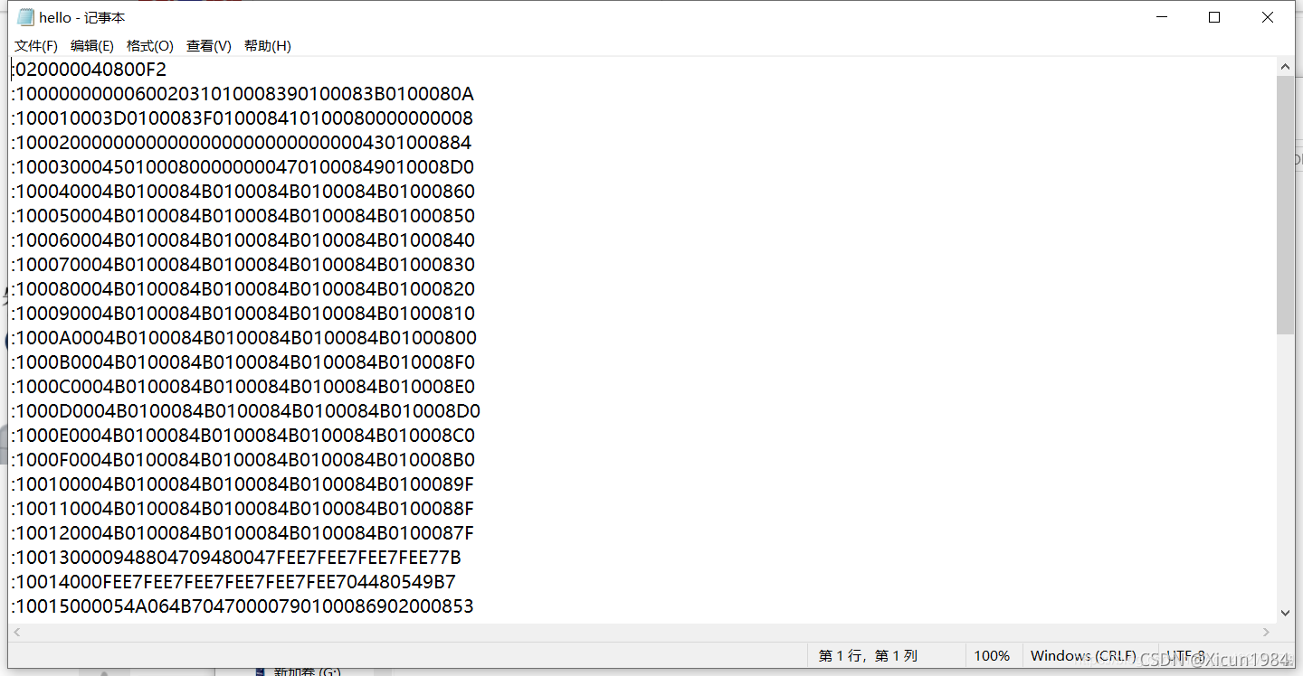0x02 该行数据中有两个数据 0x00 0x00 本行数据的起始地址位 0x04 用来标识扩展线性地址的记录 该字节还可以是其他值,下面是其他值的含义 00:用来记录数据,HEX文件的大部分记录都是数据记录 01:用来标识文件结束,放在文件的最后,标识HEX文件的结尾 02:用来标识扩展段地址的记录 03:开始段地址记录 05:开始线性地址记录 0x08 0x00 该行两个字节的数据 数据类型是 04 ,即该行记录的是一个拓展地址(0x08 0x00 是地址信息,用法是将该地址(0x0800<<16) 后作为基地址 0xF2 校验和,校验和= 0x100 - 累加和。