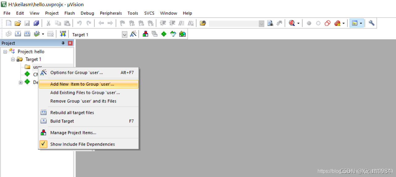 鼠标右键单击Source Group 1,选择Add New Item to Group,如下图: