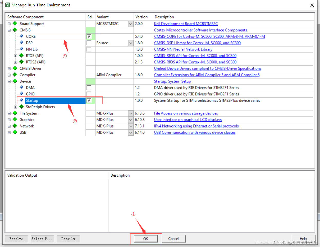 然后是运行环境选择,CMSIS下选择CORE,Device下选择Startup,然后点击OK,如下图: