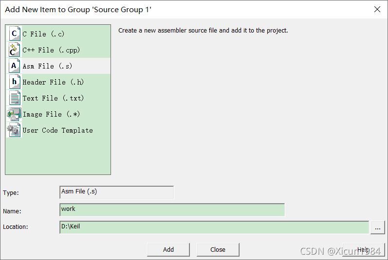 ?选择 Asm File (.s) ,设置源文件的名称,点击Add,如下图: