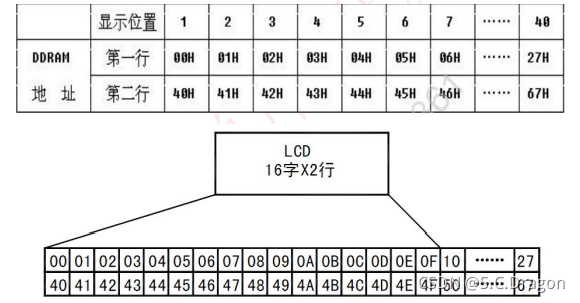 ?????????在 LCD1602 内部含有 80 个字节的 DDRAM,它是用来寄存显示字符的。其地址 和屏幕的对应关系如下表:
