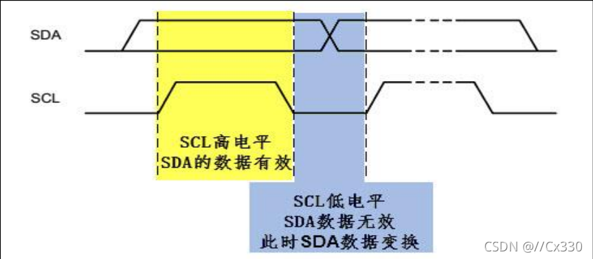 SCL为高电平的时候SDA表示的数据有效,即此时的SDA为高电平时表示数据1,为低电平表示数据0 -