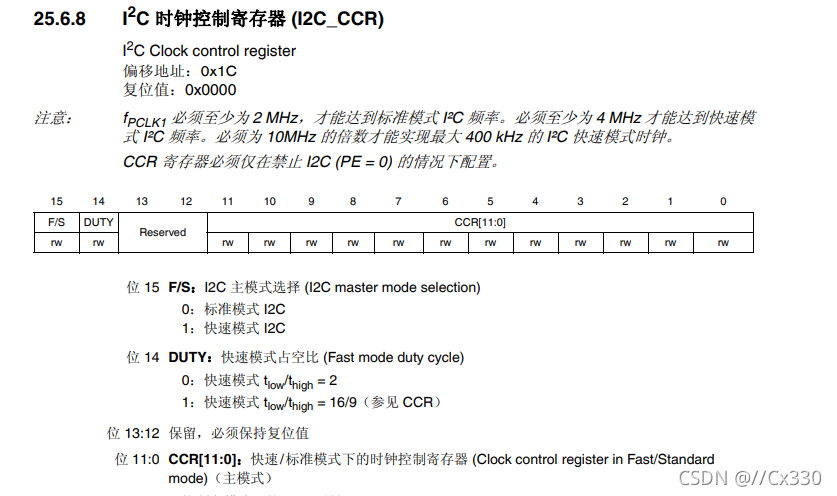 CCR寄存器中12位的配置因子CCR,它与IIC外设的输入时钟源共同作用,产生SCL时钟。STM32的IIC外设输入时钟源为PCLK1。