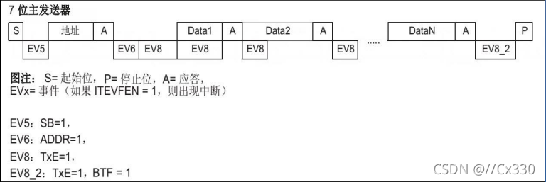 以上步骤正常执行并对ADDR位清零后,我们往IIC的”数据寄存器DR“写入要发送的数据,这时TXE位会被重置0,表示数据寄存器非空,IIC外设通过SDA信号线一位位把数据发送出去后,又会产生”EV8“事件,即TXE位被置1,重复这个过程,就可以发送多个字节数据了;最后产生一个停止信号P,这个时候会产生EV2事件,SR1的TXE位及BTF位都被置1,表示通讯结束。