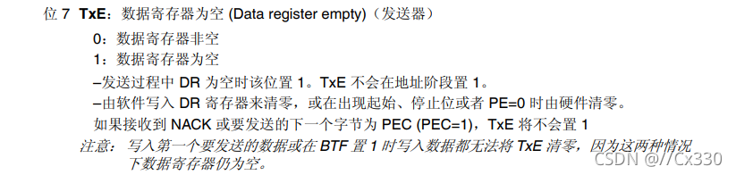 ?之后,就开始发送地址,也就是我们前面所说的8位写地址,紧接着发送设备地址并等待应答信号,若有从机应答,则产生事件”EV6“及”EV8“,这时SR1寄存器的”ADDR“位及”TXE“位被置1,ADDR为1表示地址已经发送,TXE为1表示寄存器为空。