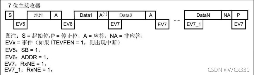 (1) 同主发送流程,起始信号(S)是由主机端产生的,控制发生起始信号后,它产生事 件“EV5”,并会对 SR1 寄存器的“SB”位置 1,表示起始信号已经发送;