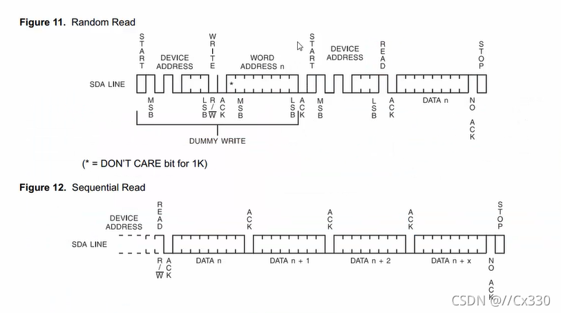 读时序的第一个通讯过程中,使用 I2C 发送设备地址寻址(写方向),接着发送要读取 的“内存地址”;第二个通讯过程中,再次使用 I2C 发送设备地址寻址(读方向),在这个过程之后,EEPROM 会向主机返回从“内存地址”开始的数据,一个字节一个字节地传输,只要主机的响应为“应答信号”,它就会一直传输下去,主机 想结束传输时,就发送“非应答信号”,并以“停止信号”结束通讯,作为从机的 EEPROM 也会停止传输。