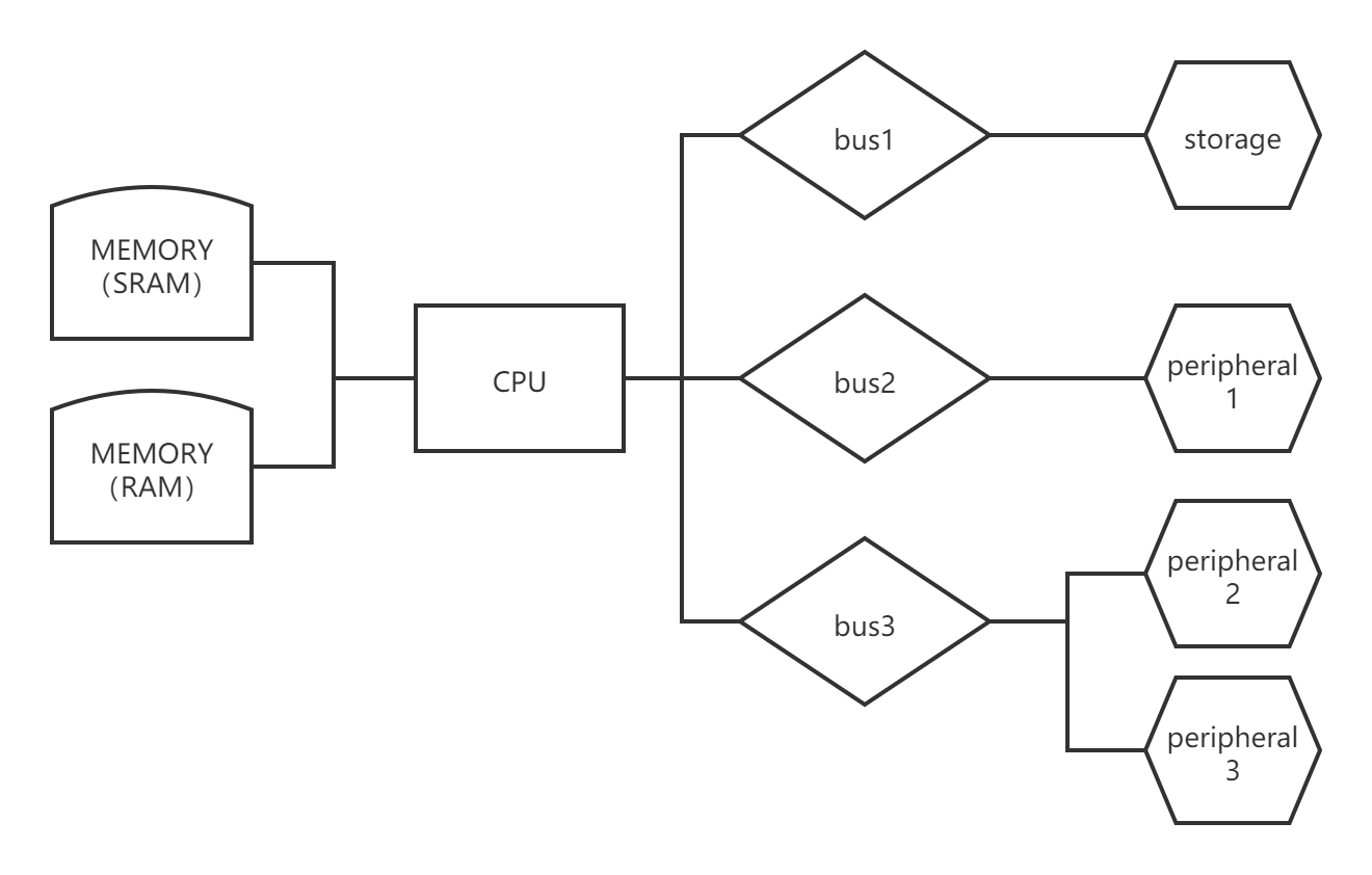 从本质上讲,目前无论是PC还是嵌入式开发板,所有计算机无外乎是两种硬件架构。一种是冯诺依曼架构体系、一种是哈佛架构体系。这两种架构体系对于仅仅从事驱动开发的嵌入式开发者是透明无感的,因此不需要掌握它俩的区别,感兴趣的话可以自行在网上搜索相关内容。 但如论是哪种架构体系计算机都是由以下基本硬件构成的:cpu、memory、storage、bus、peripheral。 它们之间的关系如下图: