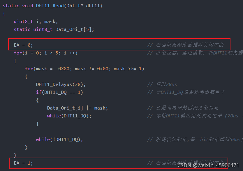 EA = 0; // 在读取温湿度数据时关闭中断